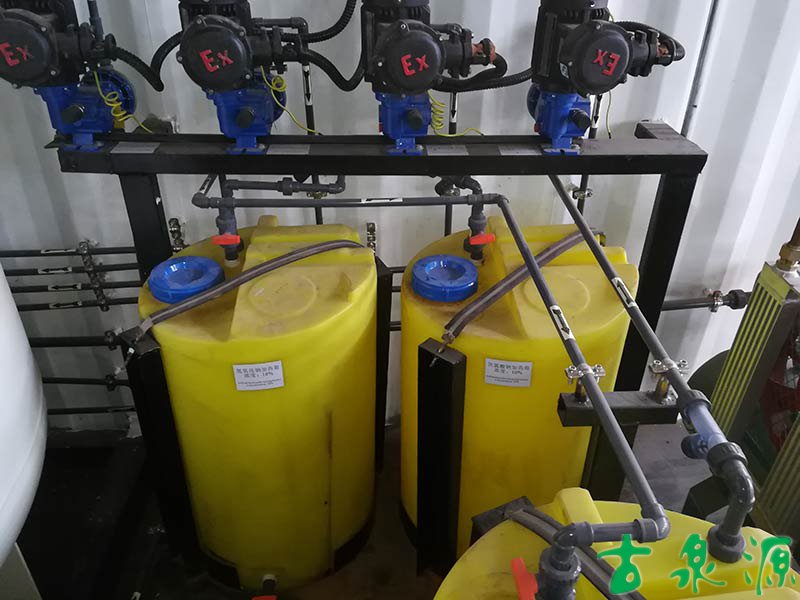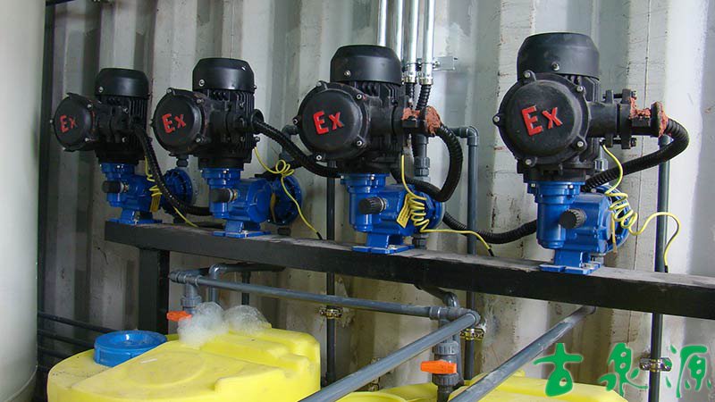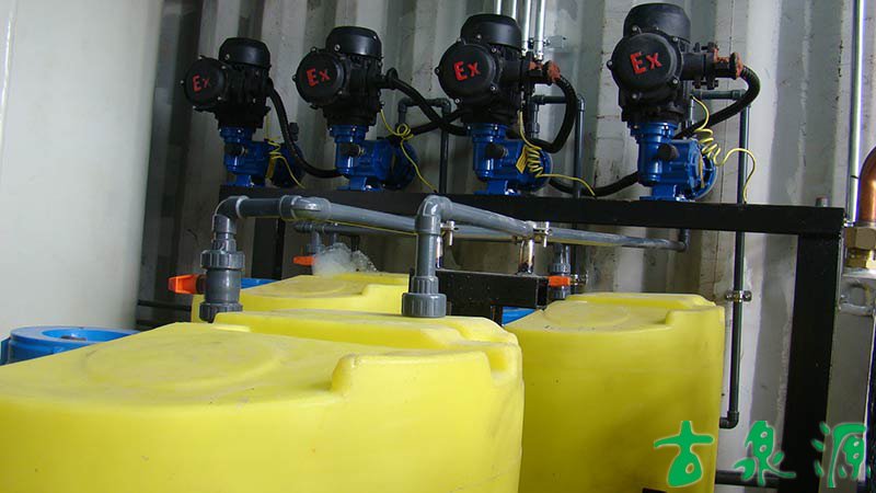 加药系统(dosing system)主要由溶液箱、搅拌箱(带搅拌器)、计量泵、液位计、电控柜、管路、阀门、安全阀、止回阀、压力表、过滤器、底座、扶梯等组成(可根据用户实际要求配置)。加药系统根据所需药剂浓度,在搅拌箱内配制,经搅拌器搅拌均匀后投入溶液箱、用计量泵(加药泵)向投药点或指定的系统中输送所配制的溶液。