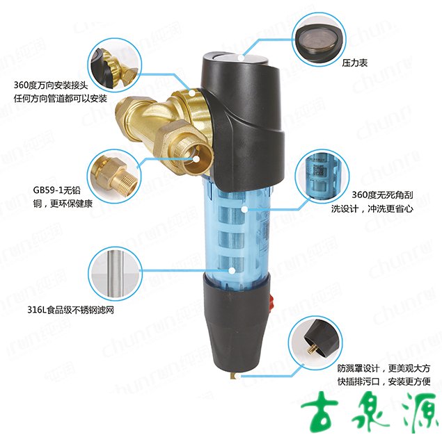 1.食品级PA-12高密度材料6MM加厚航天防爆瓶,抗压50公斤以上 2.排污手柄结合人体工程学和视觉美学完美设计融合,更美观实用 3.纯润蓝半透明杯体,有效减少光线进入,减少藻类滋生 4.日期刻度记忆功能,方便安全 5.超大杯体,瞬间出水量更大 6.防水锤沖击设计,更安全 7.标配一寸转6分活接头 8.5T/小时大流量