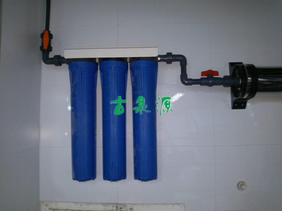 项目因为是家用,所以安装快速简单,从送货到验收一共只用去了半天的时间。前置预处理我们采用了三个单级过滤器的串联,分别应用了5μmPP棉、颗粒活性炭、1μmPP棉,将水中的大于1μm的杂质颗粒等除掉,并且可以有效的保护超滤膜的使用寿命。